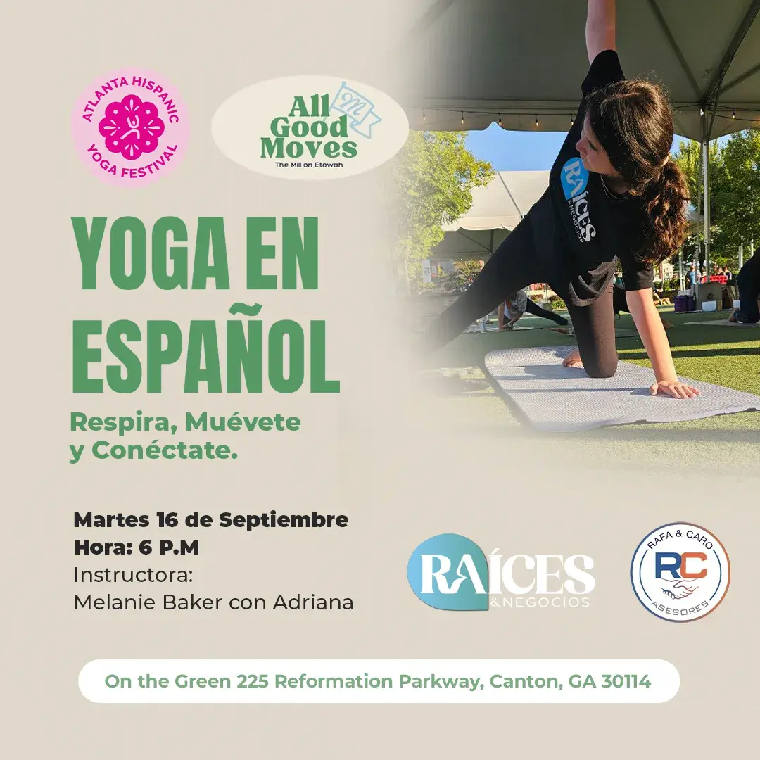 ✨ Yoga en Español 🧘🏻♀️ Organizado por Atlanta Hispanic Yoga Fest y The Mill on Etowah Patrocinado por Raíces y Negocios Magazine y Rafa y Caro Asesores te invitan 🌿 ¡Ven, muévete, respira y conéctate con la comunidad en español! 💚 Cada martes por la tarde disfruta de una clase gratuita de yoga en español, guiada por la instructora Melanie Baker en un ambiente relajado y acogedor. 🧘♀️ Qué traer:✔ Tu estera de yoga✔ Botella de agua 📍 Ubicación: The Mill on Etowah225 Reforma Parkway, Canton, GA 30114 ⏰ Cuándo: Todos los martes de septiembre | 6:00 p.m. ✨ No necesitas registrarte, solo llega unos minutos antes, encuentra tu lugar y fluye con nosotras. 👉 Evento gratuito y abierto a toda la comunidad. 💬 Raíces yNegocios Magazine y Rafa y Caro Asesores te invitan a ser parte de este espacio de bienestar y conexión comunitaria. ✨ Todos los buenos movimientos comienzan aquí!